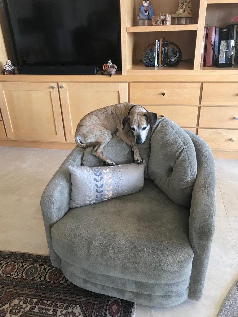 After we got home, Brindy decided to try out a new position on the chair.