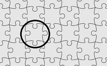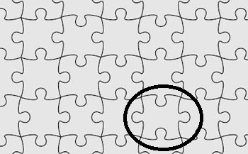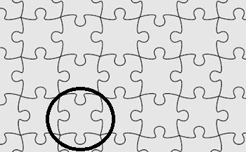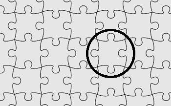 Not only are there no standard terms for the parts of the pieces, there are apparently not names for the types of pieces either. For those of you not familiar with standard jigsaws, there are six basic kinds of configurations (not counting the edge pieces).