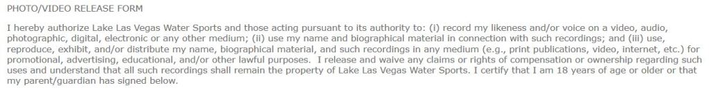 I mentioned in my previous post that I had planned to take mom out on Lake Las Vegas for her mother’s day present, but had to change our plans. What stopped me was the waiver form they wanted me to sign. Here is a copy of the actual waiver part of the form: