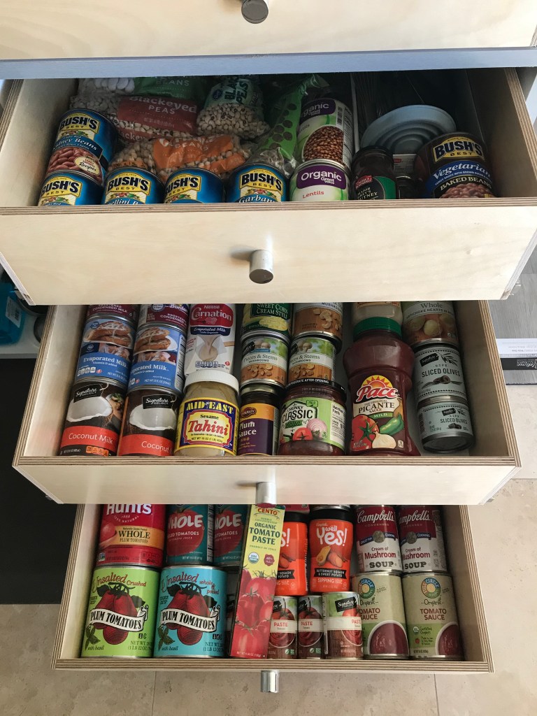 Four new drawers (the drawer fronts are still being manufactured), three of which now contain all my canned goods that I could never arrange efficiently in my pantry.