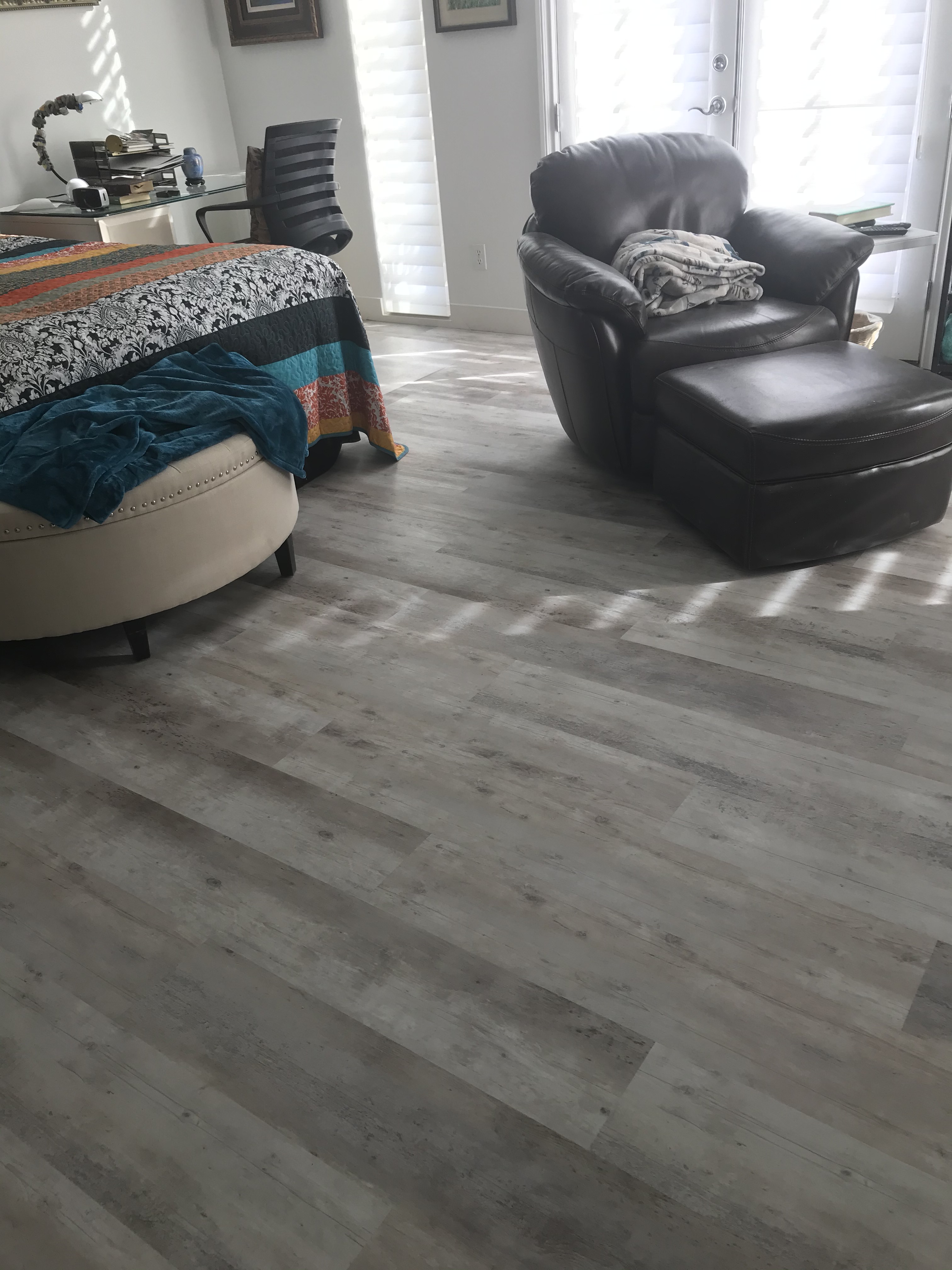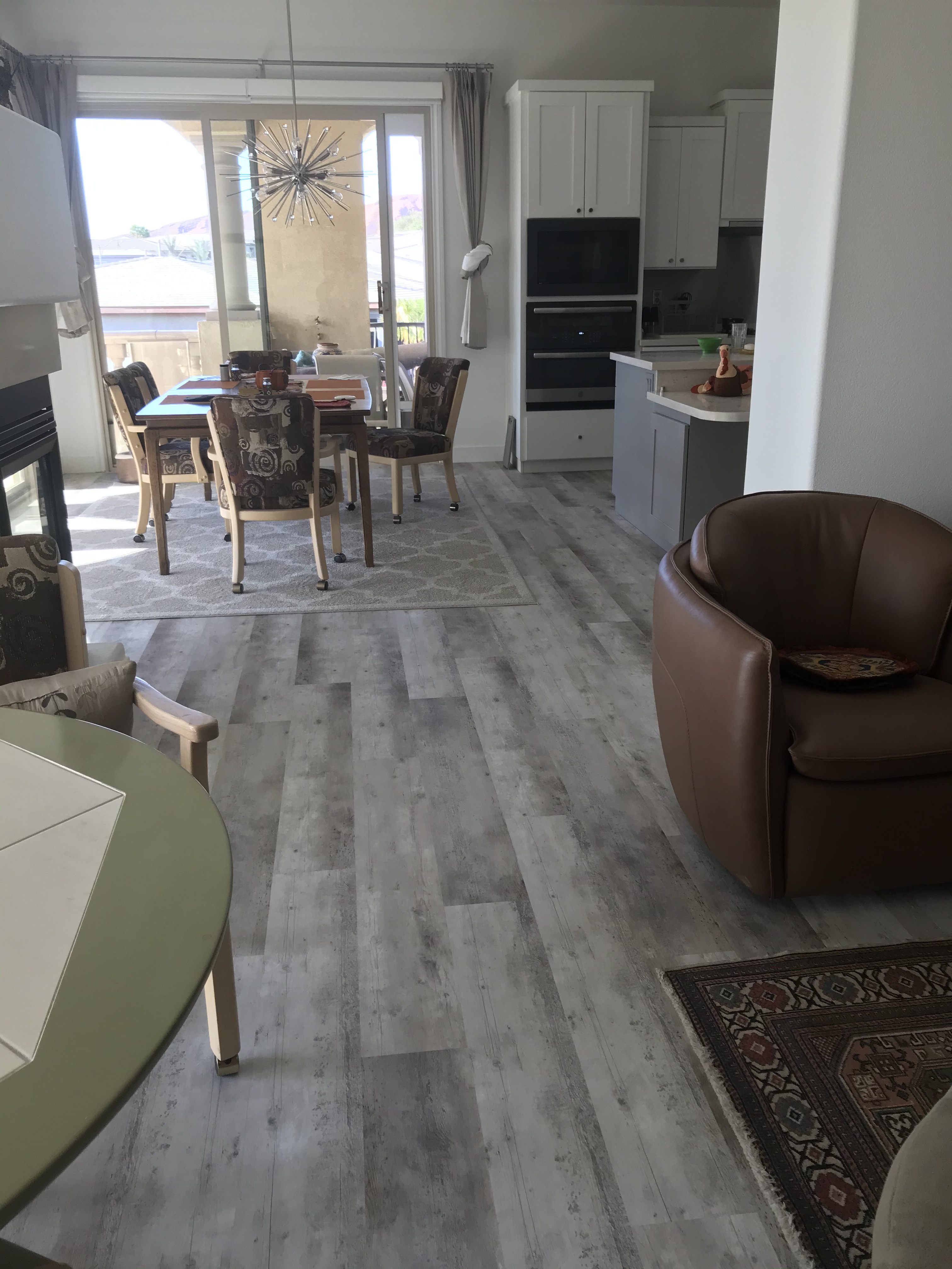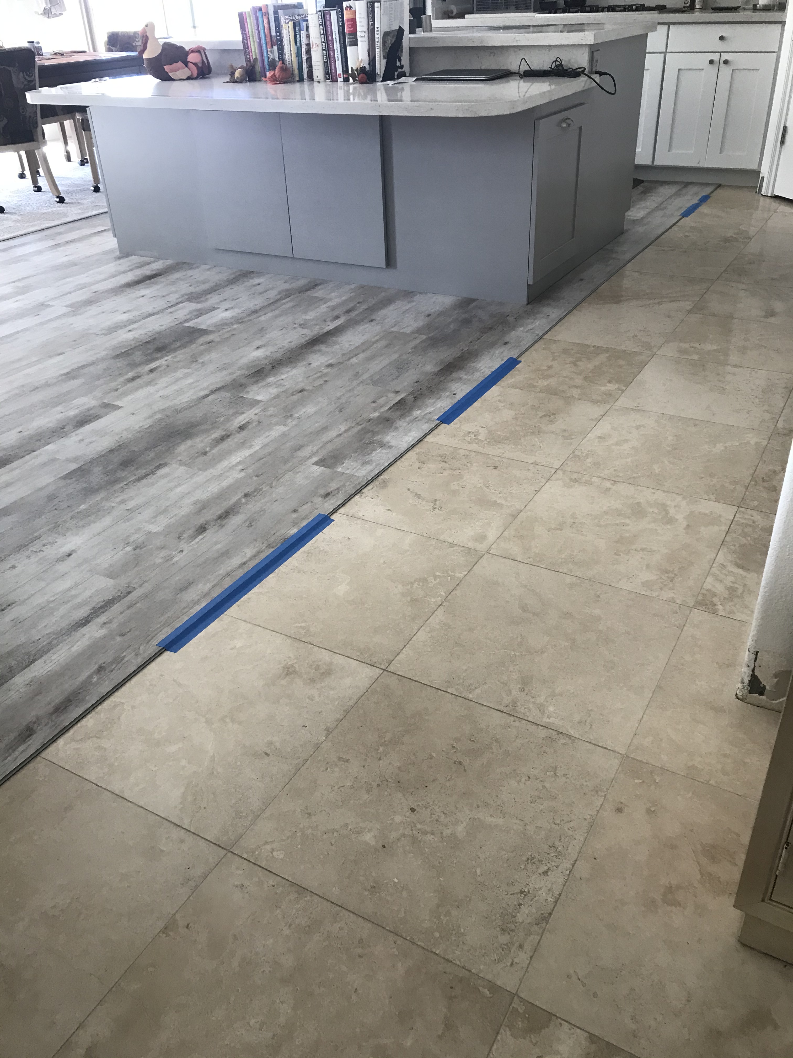 It would have been an even bigger mess if we had had to take up the old travertine floor. Luckily, the new vinyl could be laid right over the stone. It took five days and the flooring crew finished up at 8:30 pm on Tuesday before Thanksgiving. Here are some pictures: