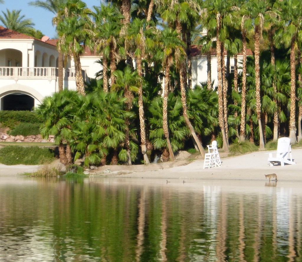 There are two coyotes in this picture; one below the chair on the right and one at the water’s edge to the right of the green grass at lake level. The building in back is the golf clubhouse with lots of activity on a Sunday morning. Coyotes obviously not very concerned!