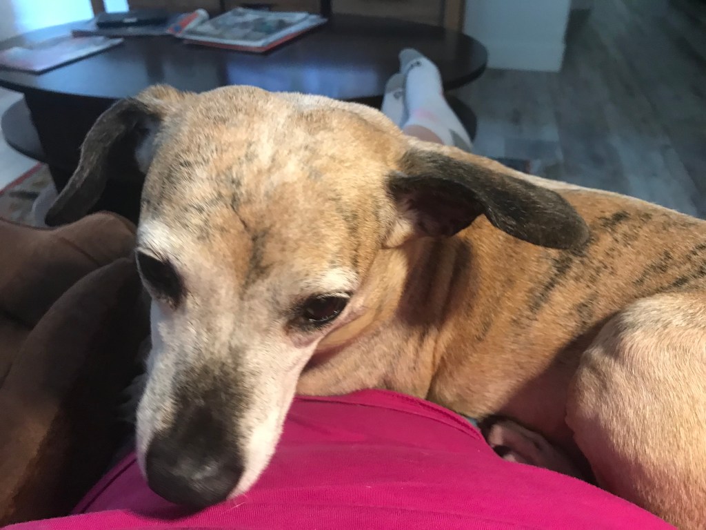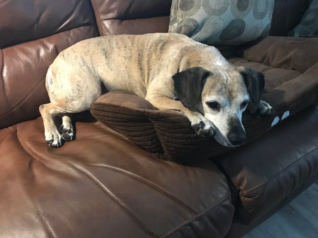 Brindy hasn’t made much of an appearance on this blog lately, so here are a few pictures. Generally she is perfectly content to be in her bed at the far end of the couch while I am on the other end. This evening, though, she has snuck down to my end and is slowly working her way out of her bed: