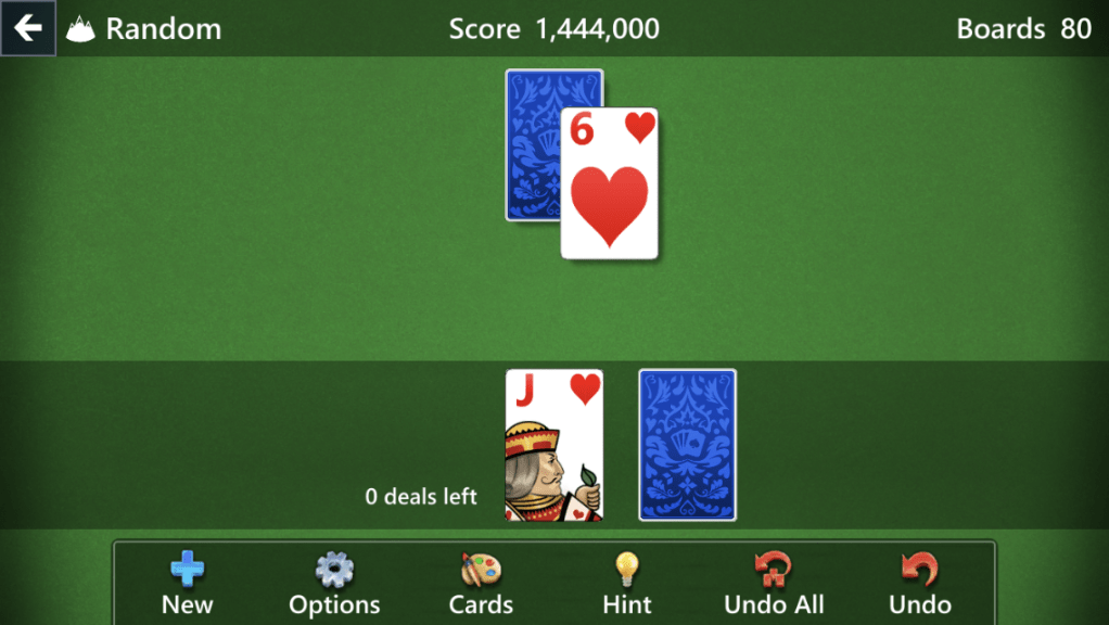 I have been playing Microsoft’s TriPeaks solitaire for many years. It’s a great game when you just have a few minutes to kill, as it is untimed and can be played in a minute or two.