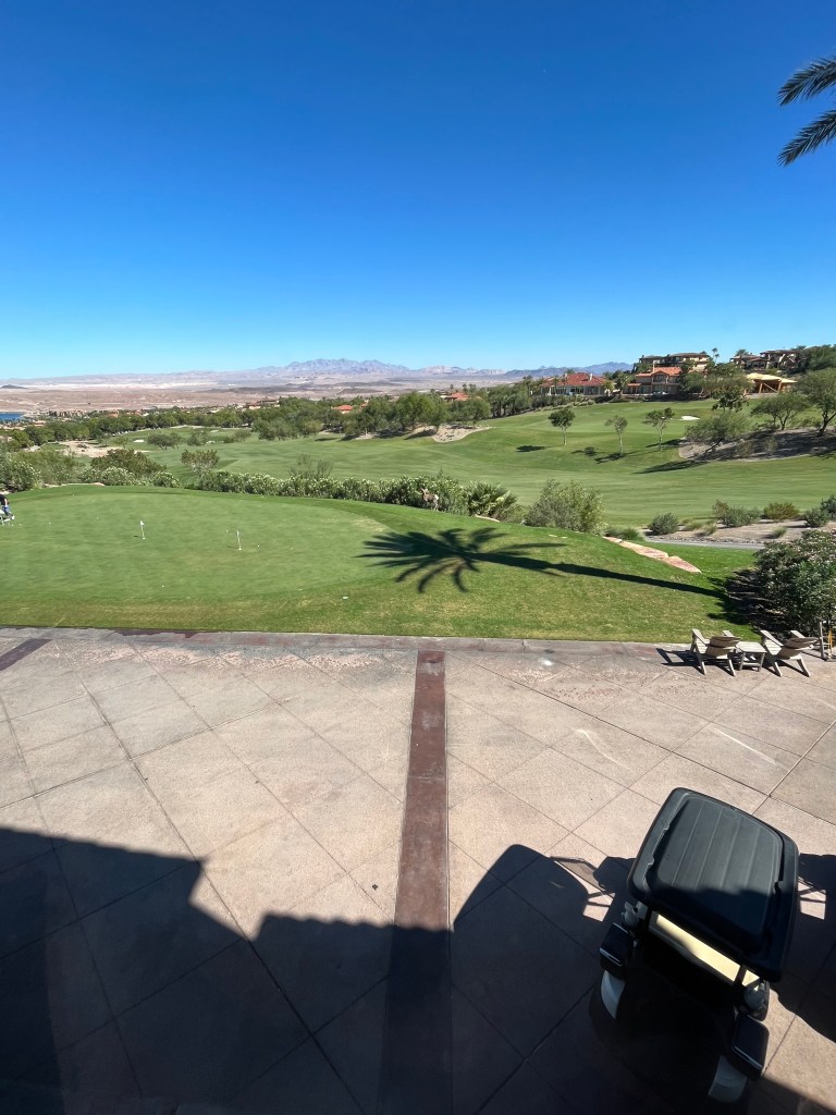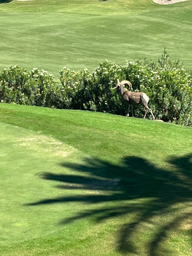 We were having lunch at the clubhouse when this beauty showed up. He is on the putting green right next to the golf cart garage. If you look at the far left you can just see two kids on the green; the ram is very unconcerned.