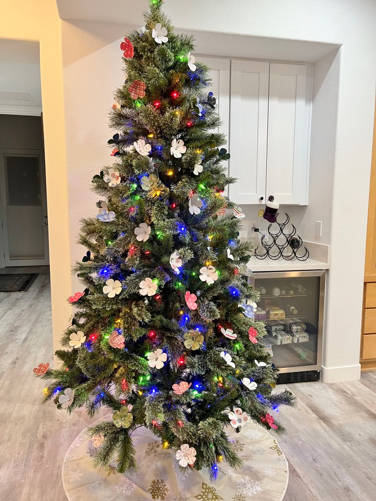 The lights were pre-strung and the tree looked quite good when they were on but a little bare when they were off. I happened to have a few sheets of holiday themed paper and some heavy card stock, so I made very simple flowers with a silver bauble in the center and some bind wire: