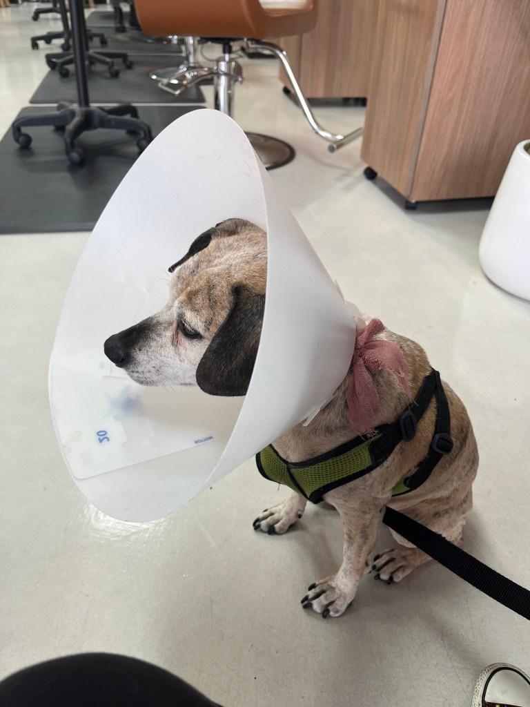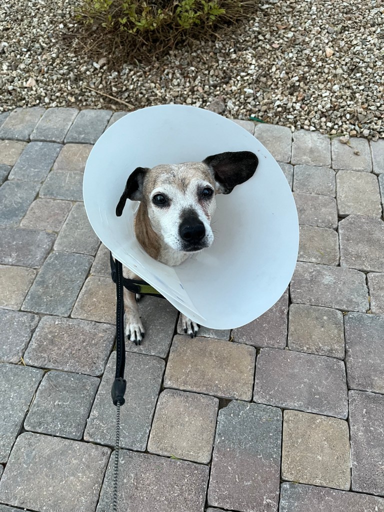 Brindy poked herself in the eye the other day while snuffling in some bushes for the dried dates she loves to eat. She had to go to the vet as her eye was not getting better and it turns out she has an ulcerated eye. This means she’s currently on a regimen of drops, salve, antibiotics, and pain pills. But worst of all, from her “point of view” is the cone she has to wear 24/7. She is not happy.