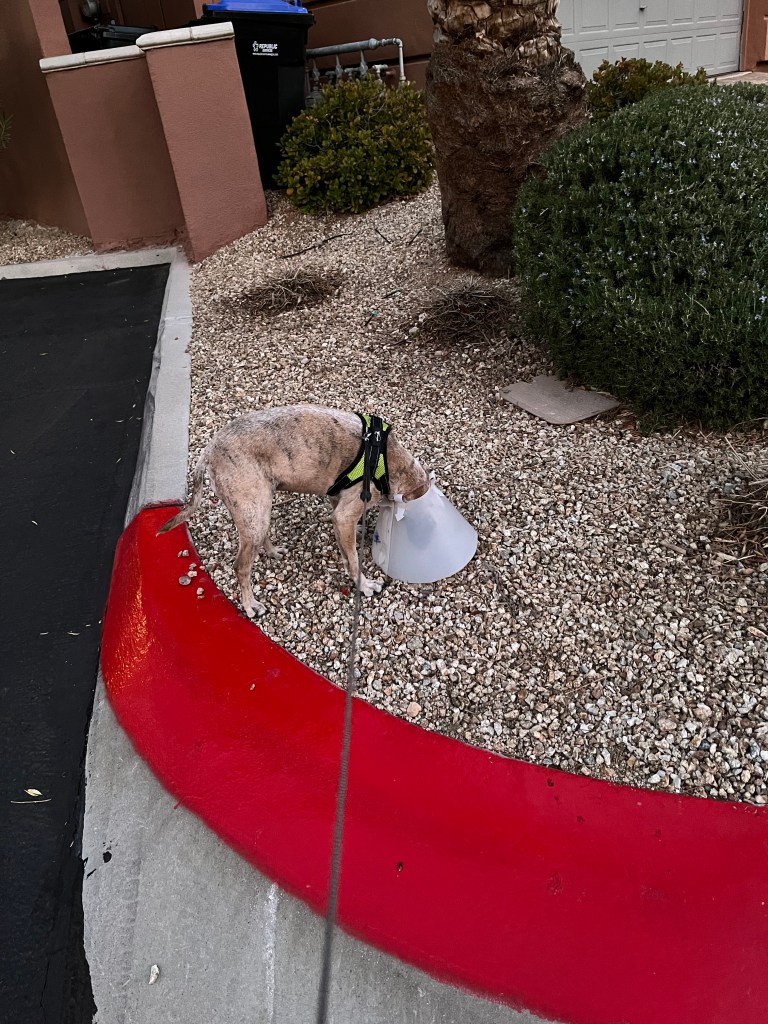 Brindy continues to adjust to the cone she has to wear. She still catches it on things, but not to the extent that she did at first. It does make it difficult for her to tell where sounds are coming from, and she often goes trotting off in the opposite direction from which I’m calling her. And mom is still accumulating bruises on her legs from when Brindy walks into her with the cone.