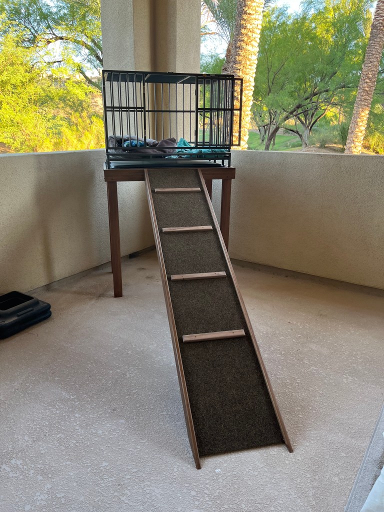 While Brindy managed to jump off the roof without injury, she did slightly injure herself falling out of bed the other day. That made it a little hard for her to manage the last foot or so up into her kennel lookout, so we added some slats to provide traction. She is in this kennel as soon as I leave the house.