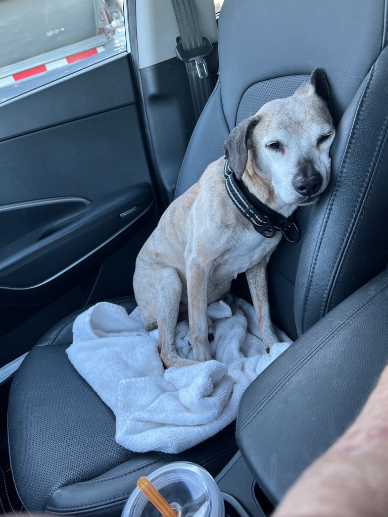 Now that the weather here is very cool, Brindy gets to go on errands with me. She much prefers waiting in the car to being put in her kennel. Lately, instead of staying in the back, she prefers to hang out in the front seat. I put a towel down for her and she often curls up on it like she would in one of her beds. But her other favored position is this: