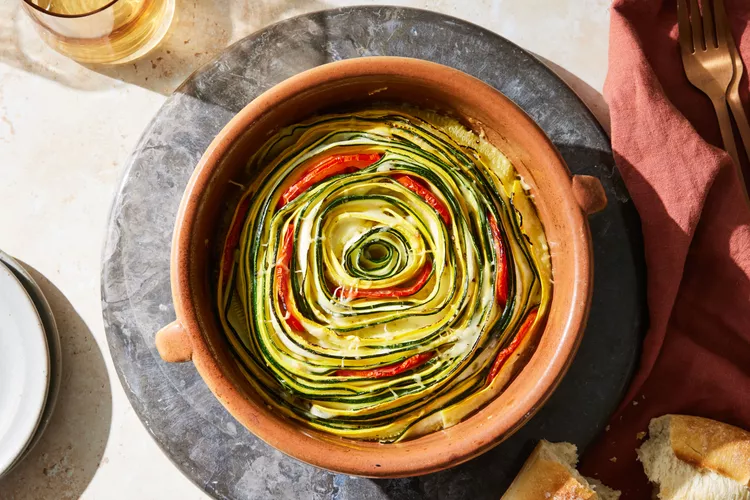outward from that center slice, continue rolling and coiling additional pieces of zucchini and yellow squash until you reach the edge of the baking dish. Season the tomato slices with salt and pepper, then tuck in intervals between the zucchini and squash. Scrape any cheese off of the baking sheets and sprinkle on top. - Bake for 30 minutes, until the zucchini and squash are tender and browned in spots. Sprinkle with sea salt. Let cool slightly, then