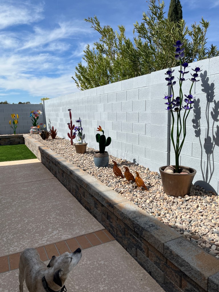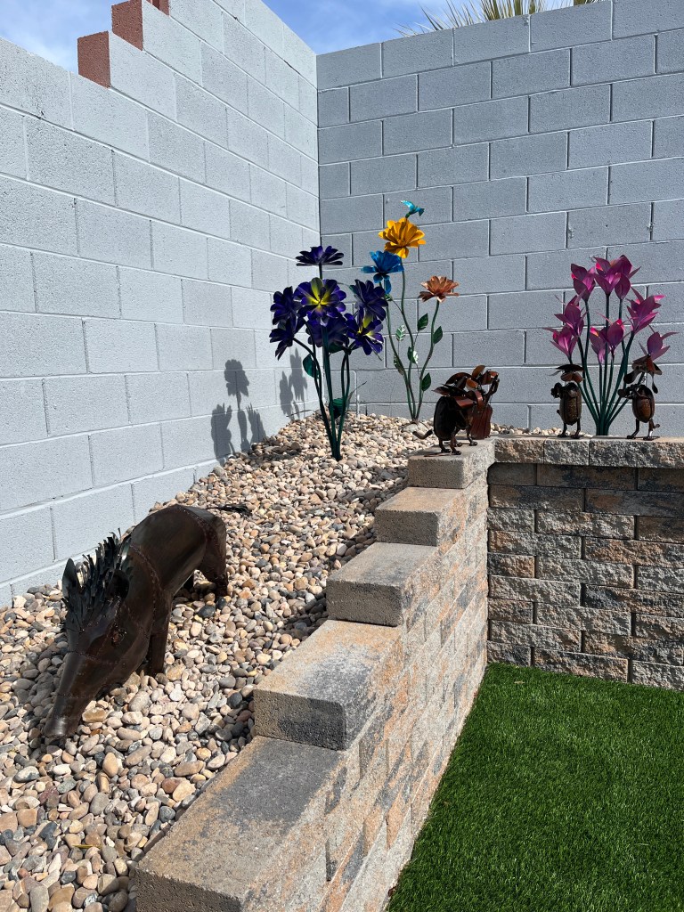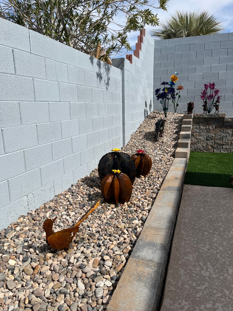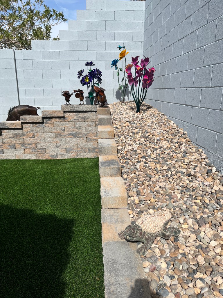 Yesterday saw the installation of some “turf” and river rock in the backyard. I’m now ready to start adding some metal art work all along in the planter.
