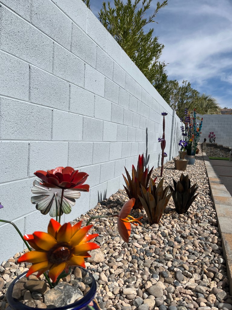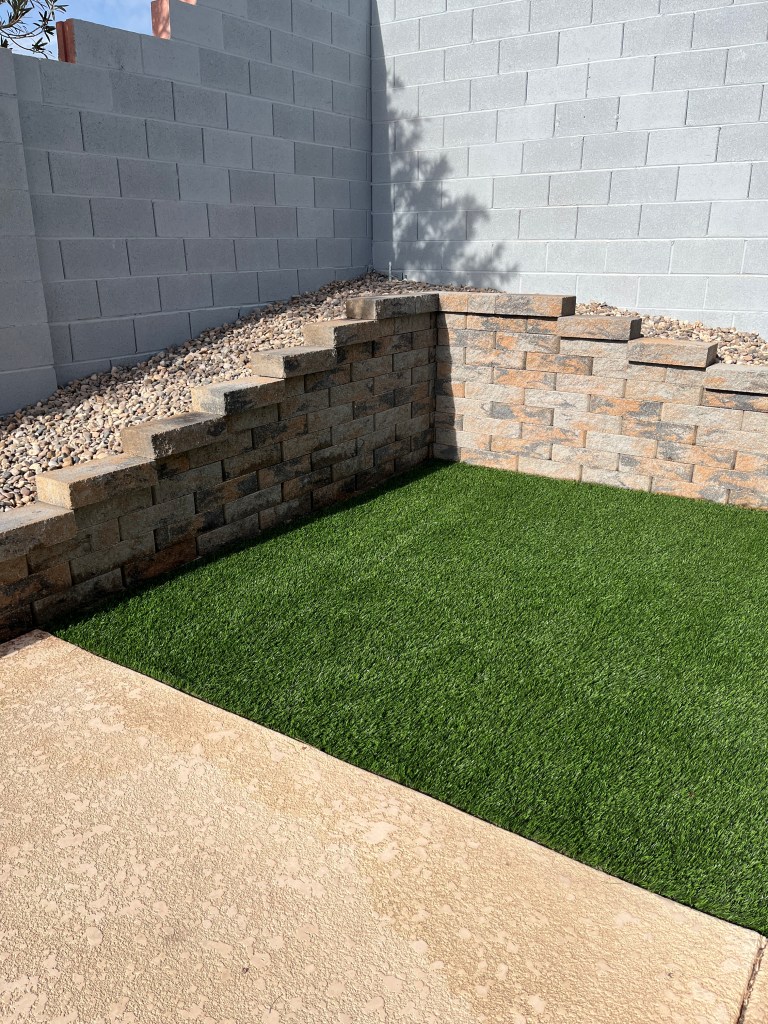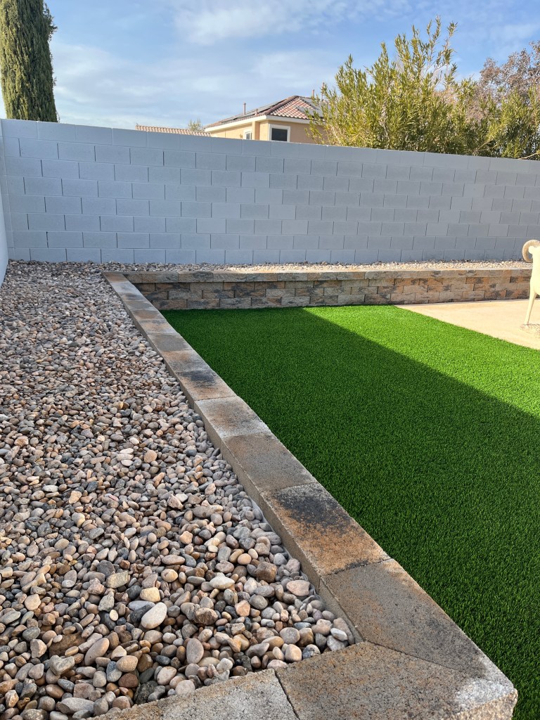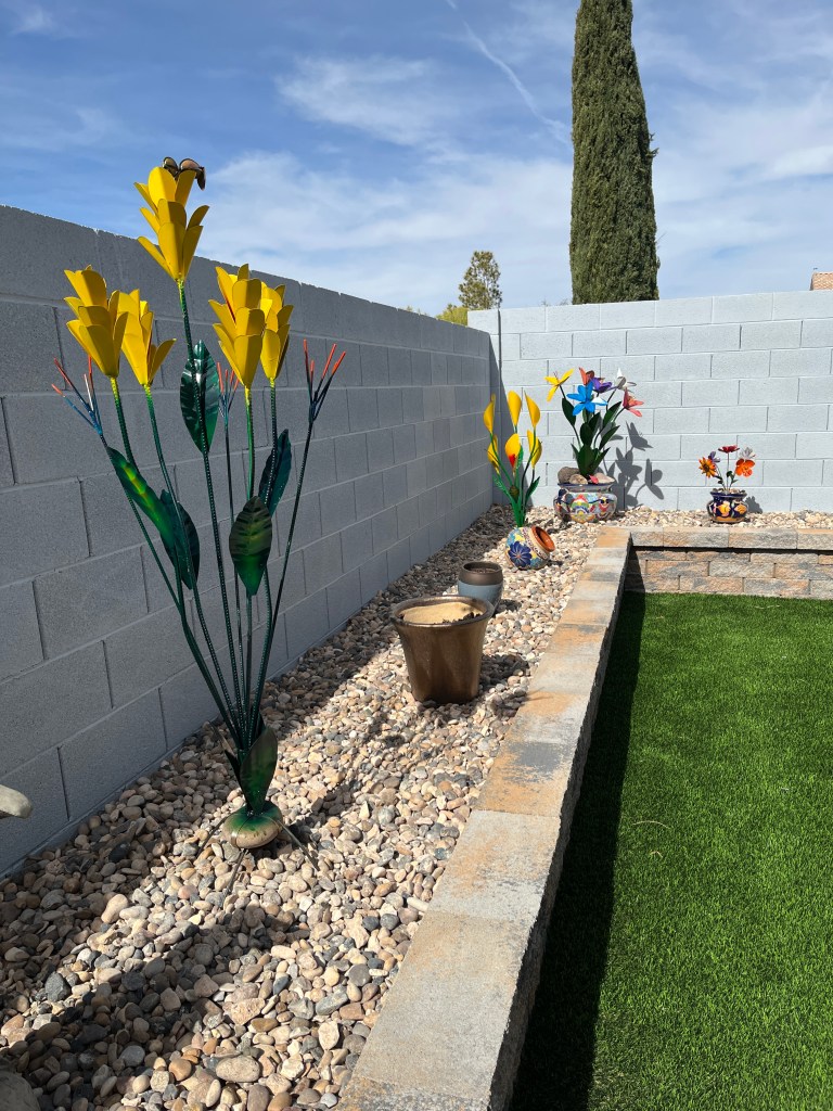 Yesterday saw the installation of some “turf” and river rock in the backyard. I’m now ready to start adding some metal art work all along in the planter.