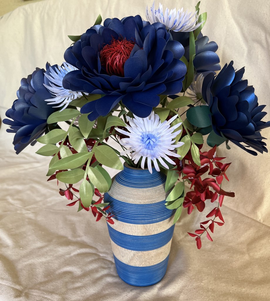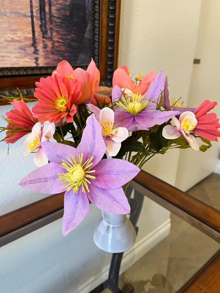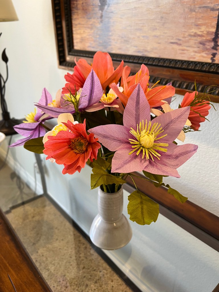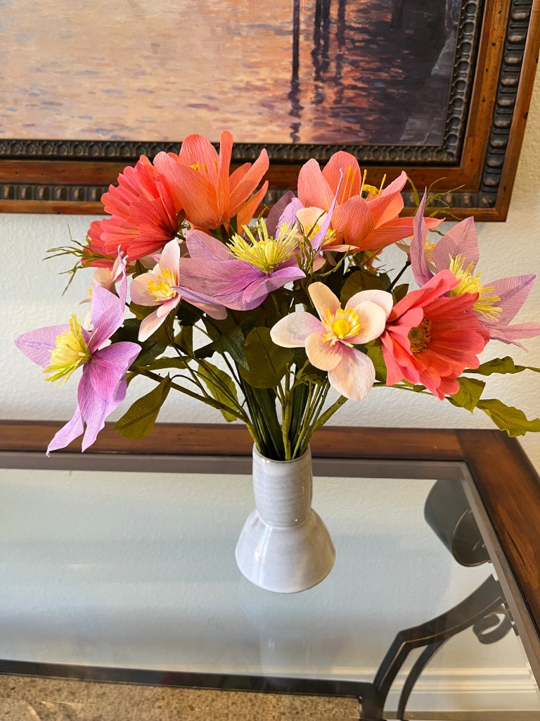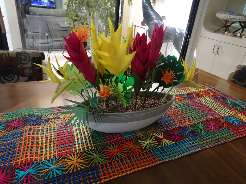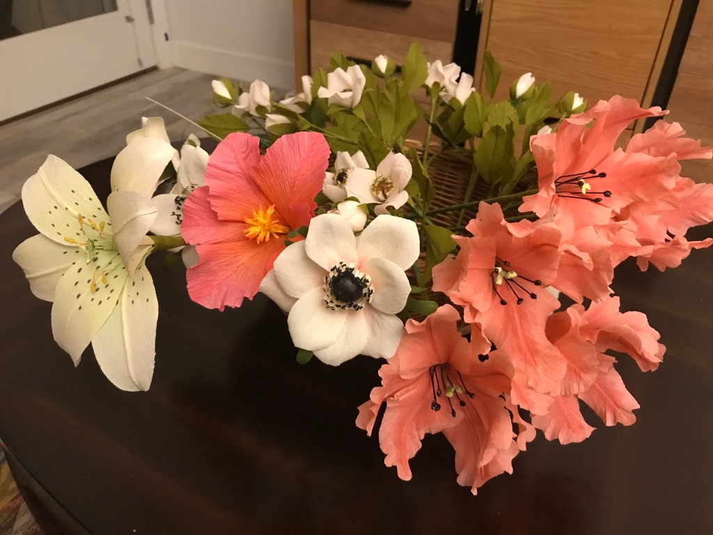Here is my work basket with the flowers I made in class. Not sure how I’m going to arrange them yet, but the hibiscus will probably go in my tropical canoe.