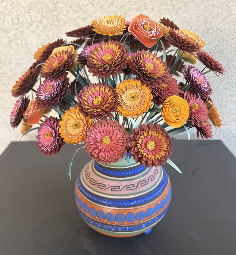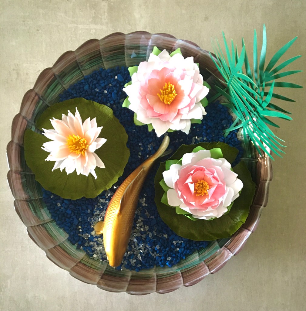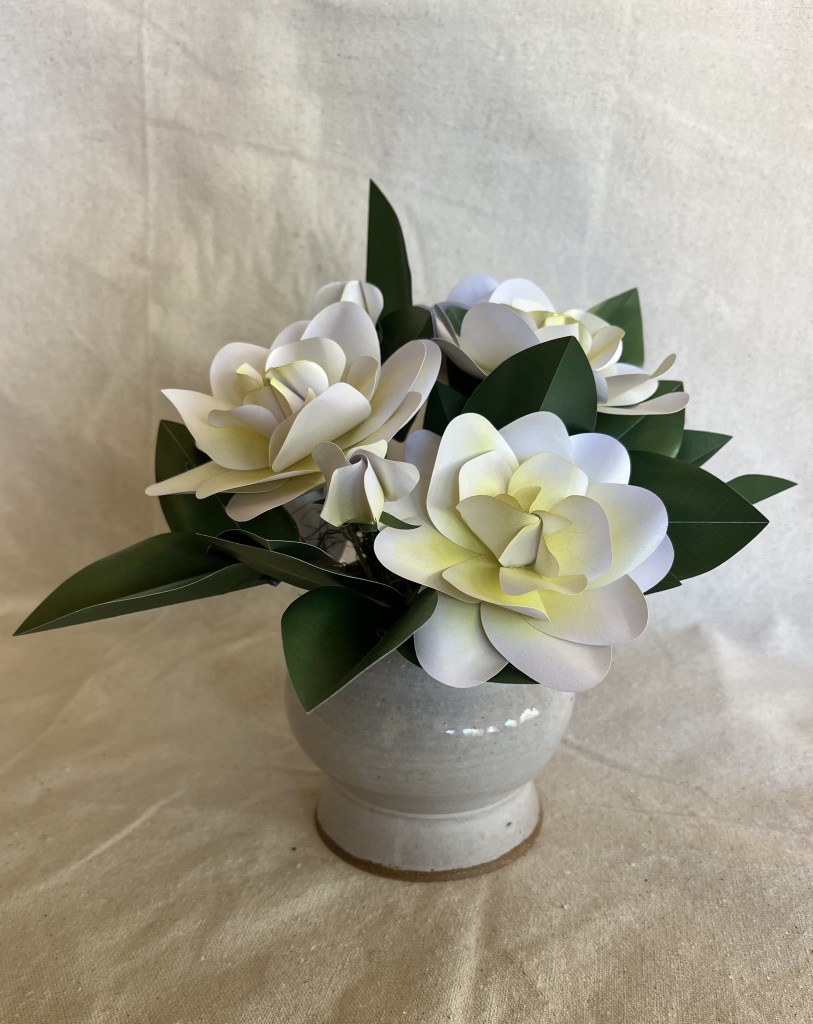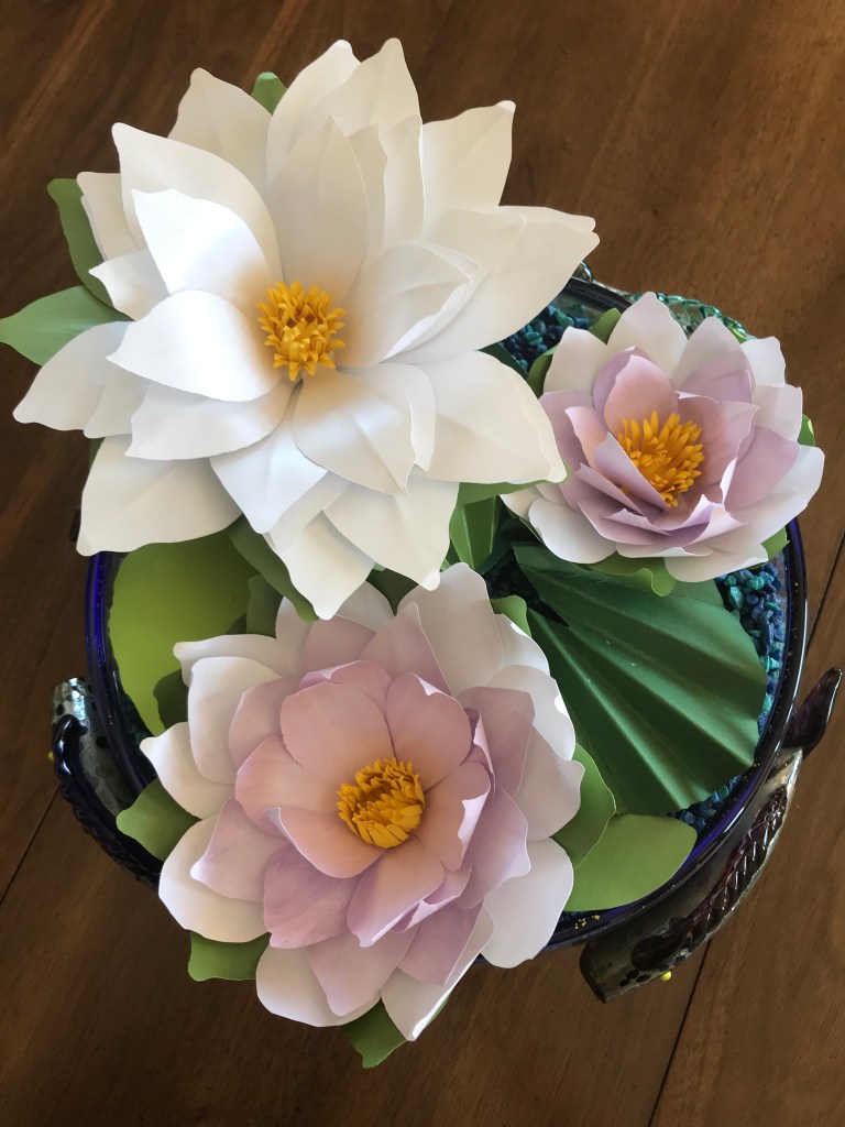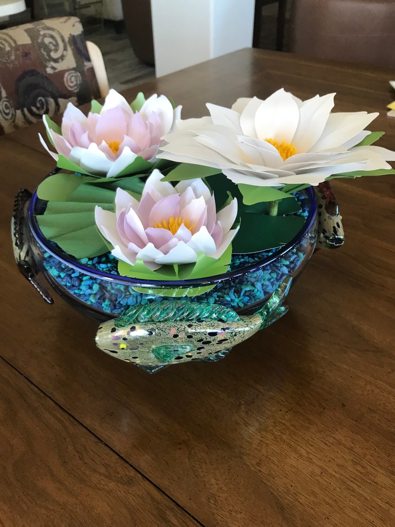 Here is my work basket with the flowers I made in class. Not sure how I’m going to arrange them yet, but the hibiscus will probably go in my tropical canoe.