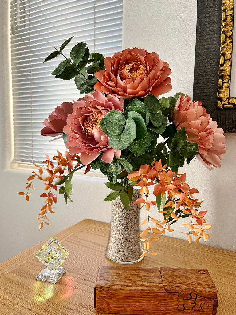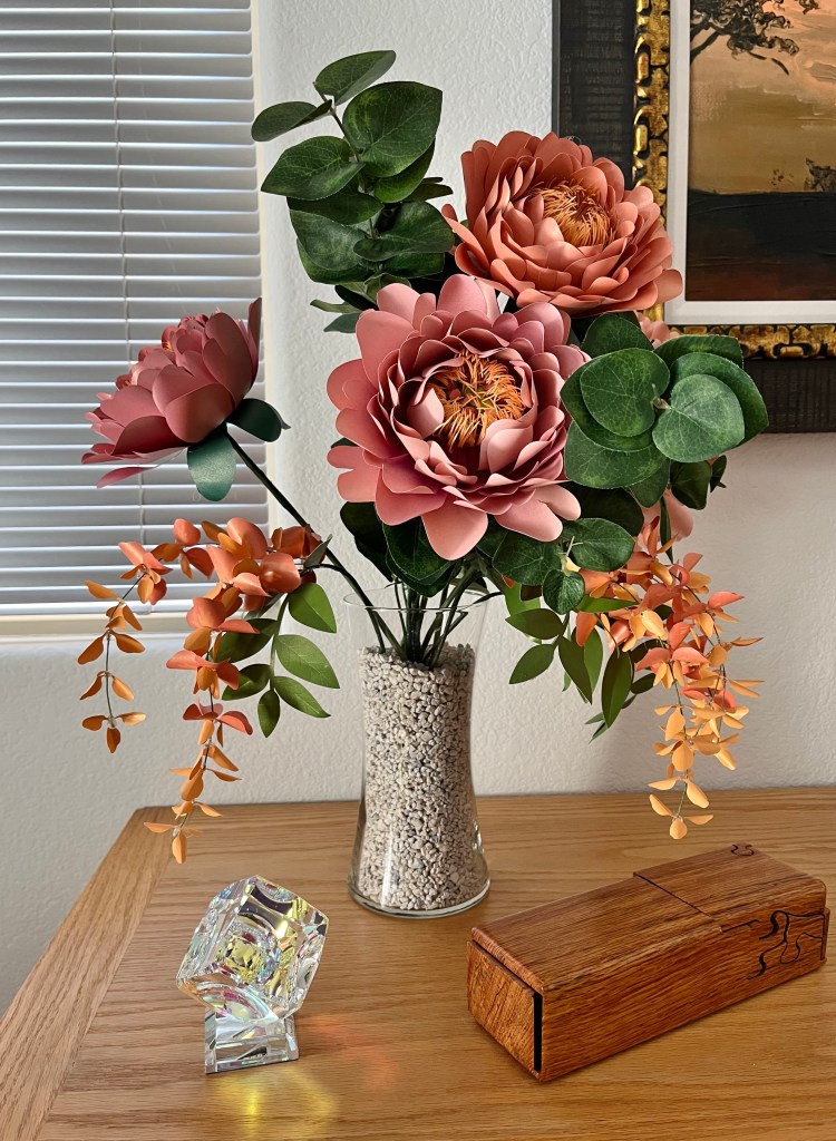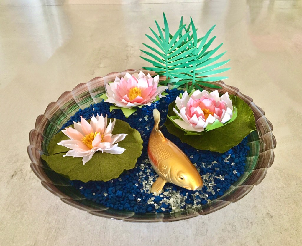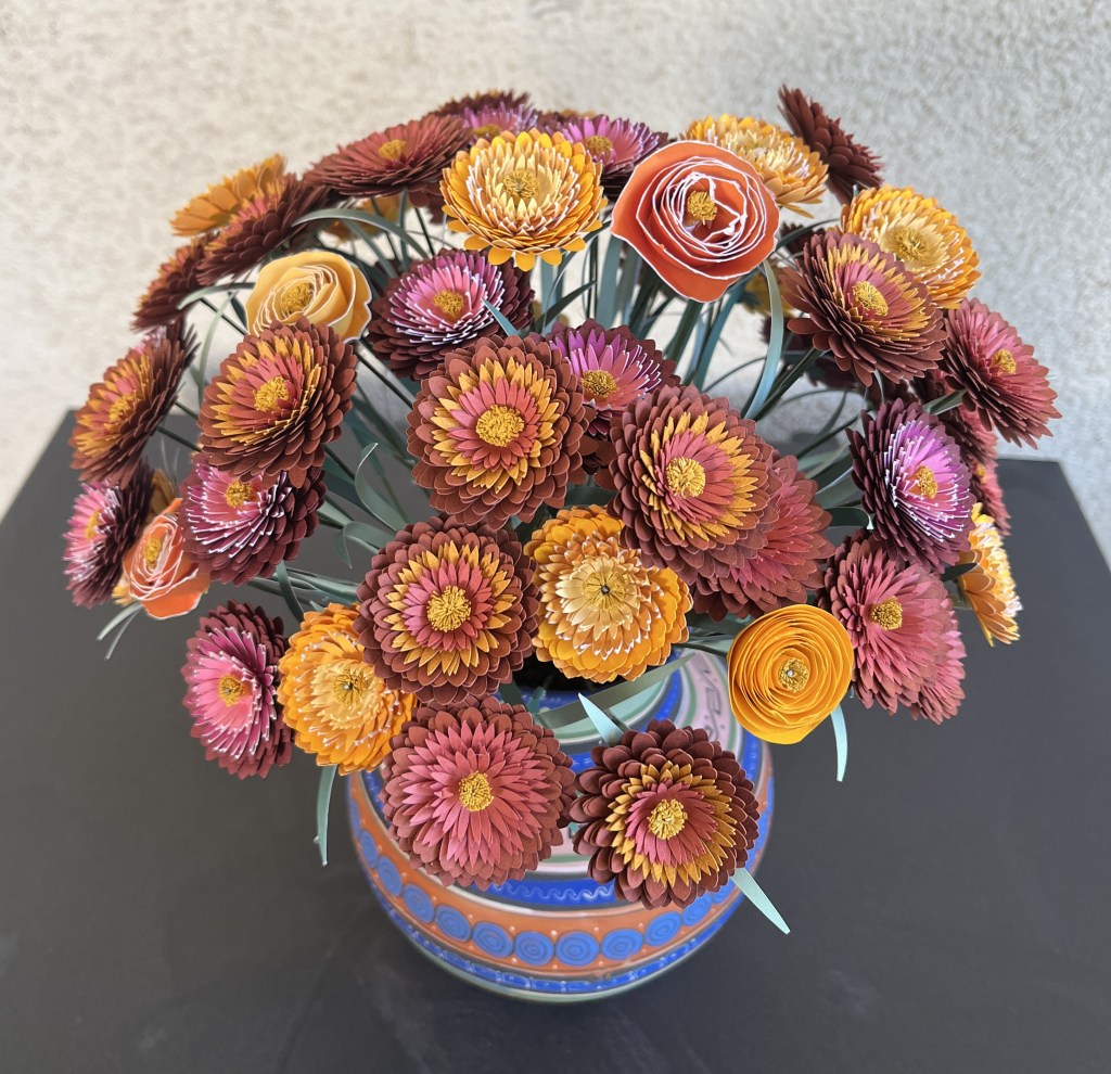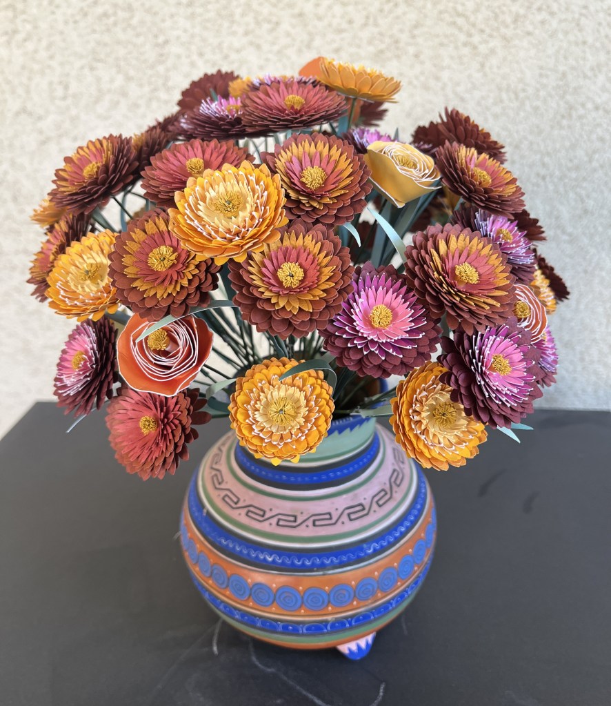 Here is my work basket with the flowers I made in class. Not sure how I’m going to arrange them yet, but the hibiscus will probably go in my tropical canoe.
