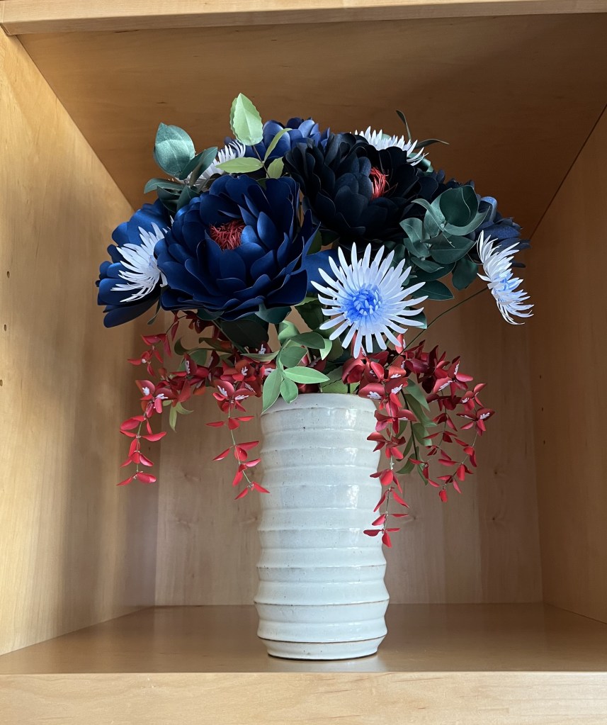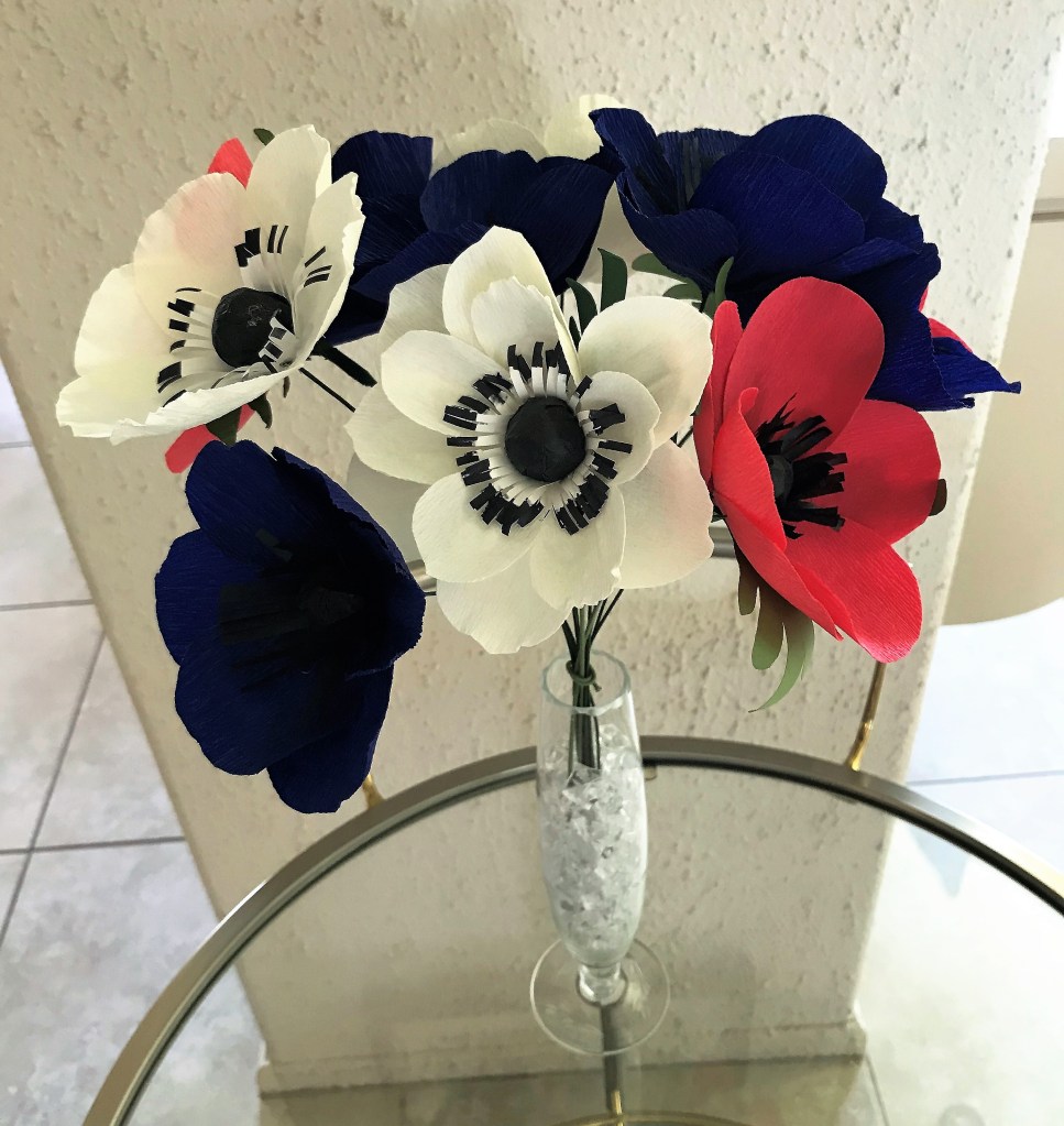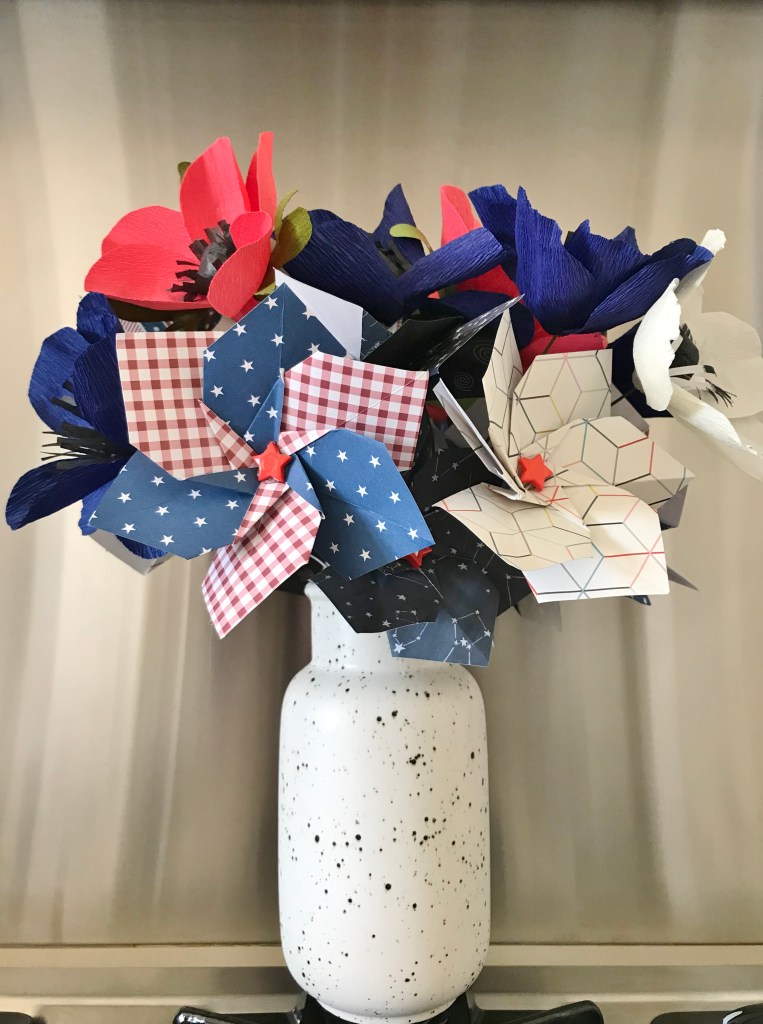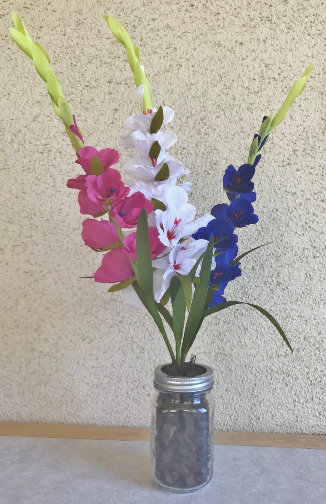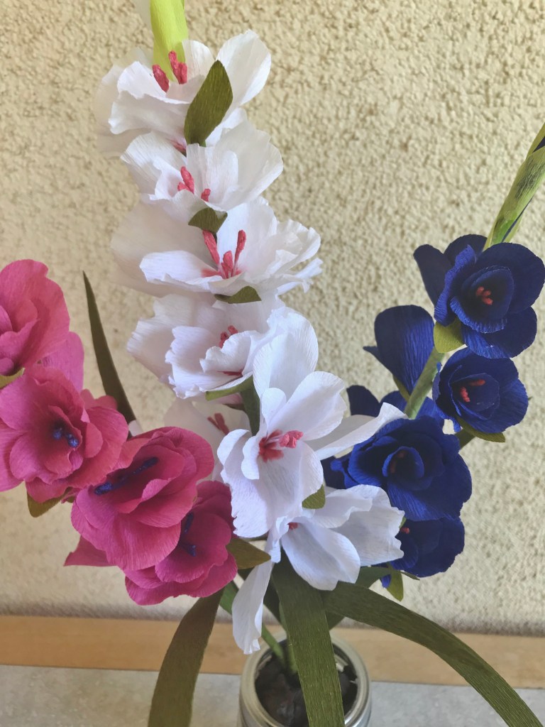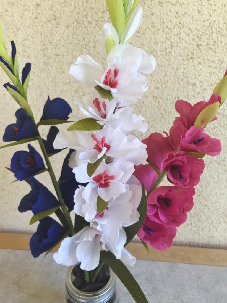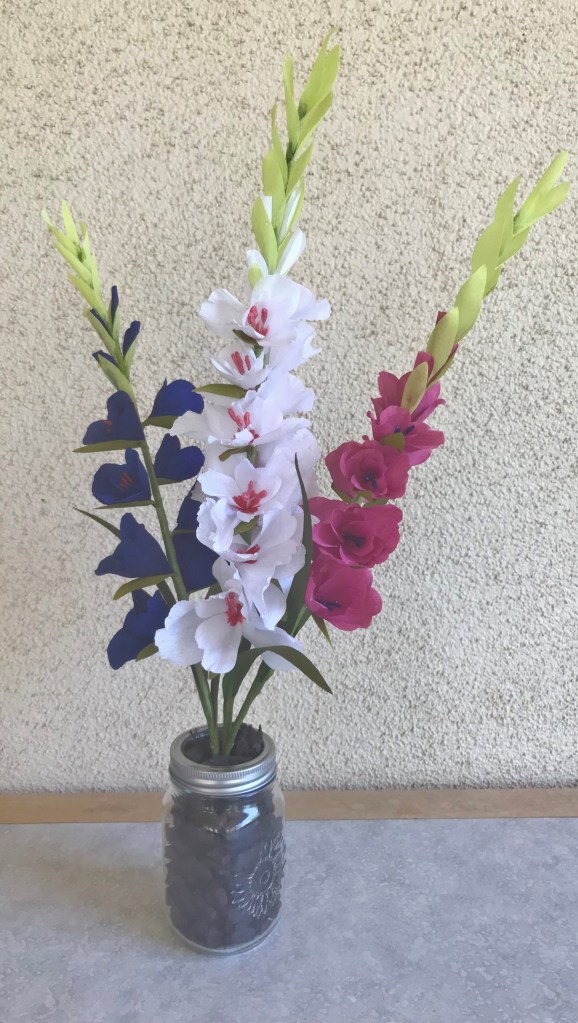 Fourth-of-July themed gladiolus. Done in crepe paper.