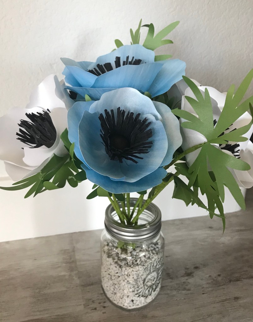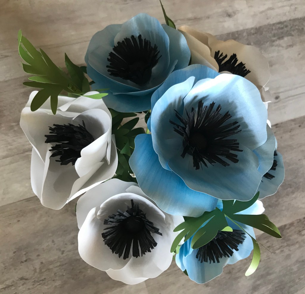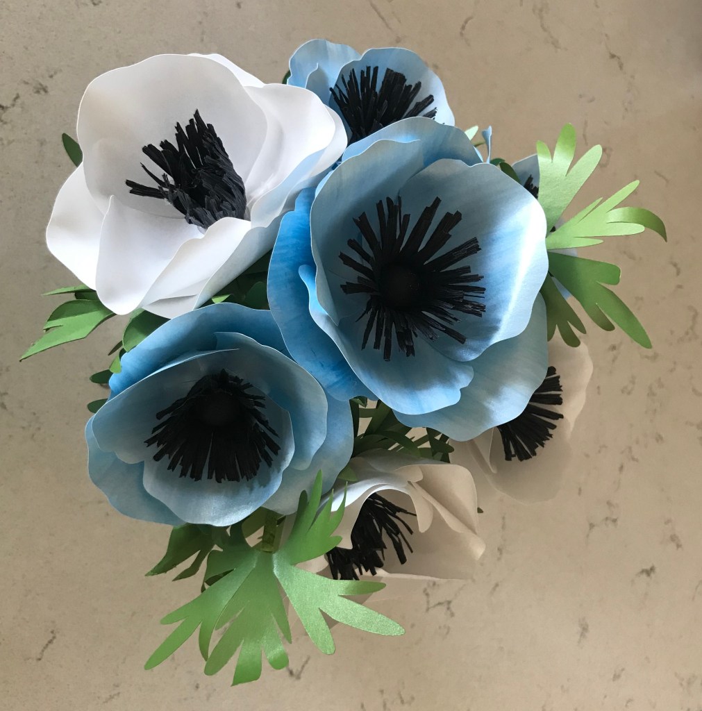 Anemones from frosted paper. The blue ones have been given a water-color wash.
