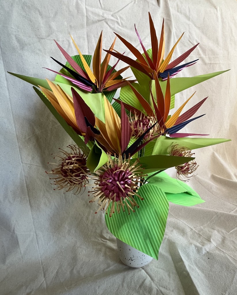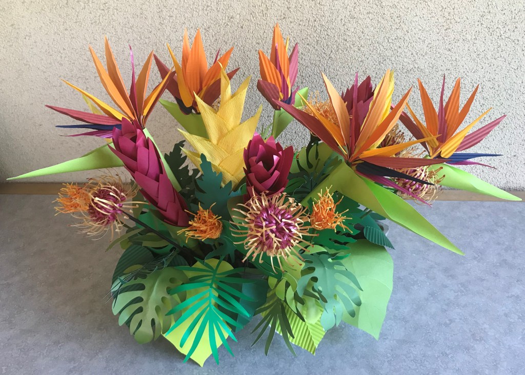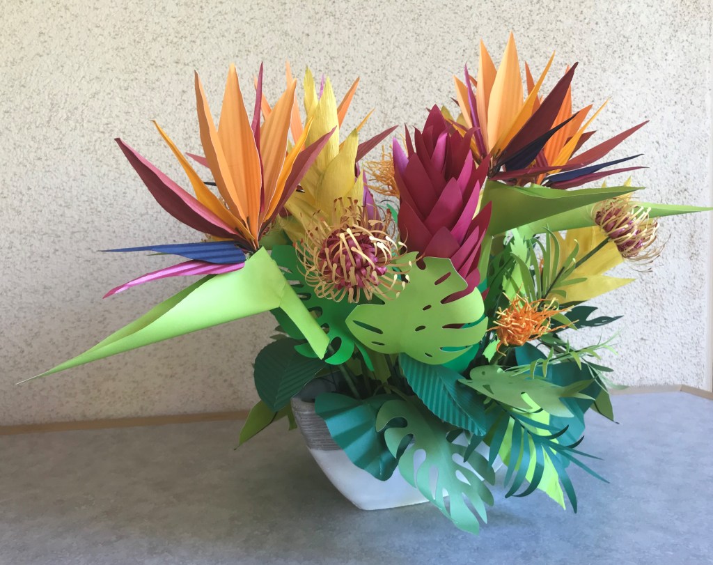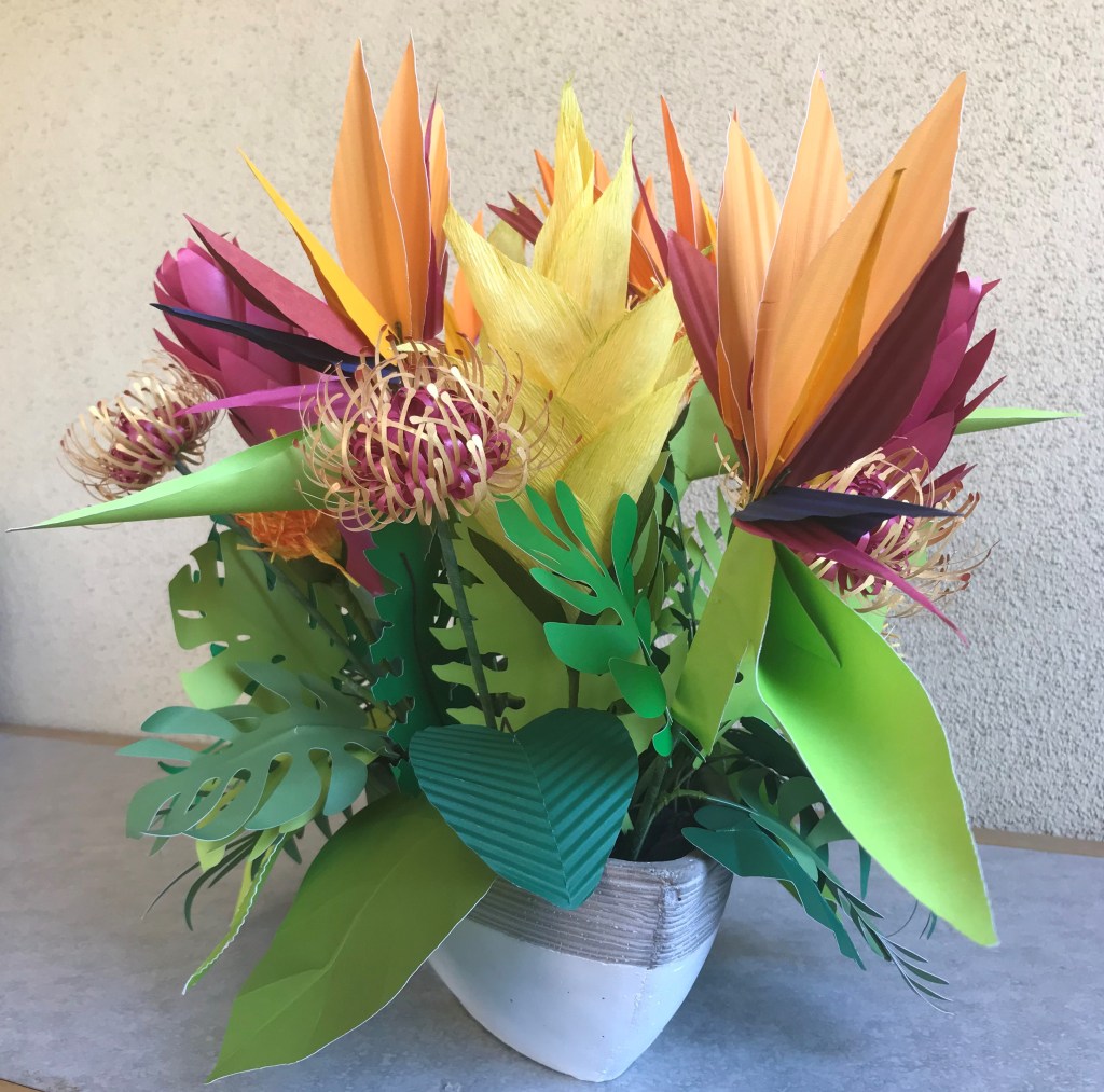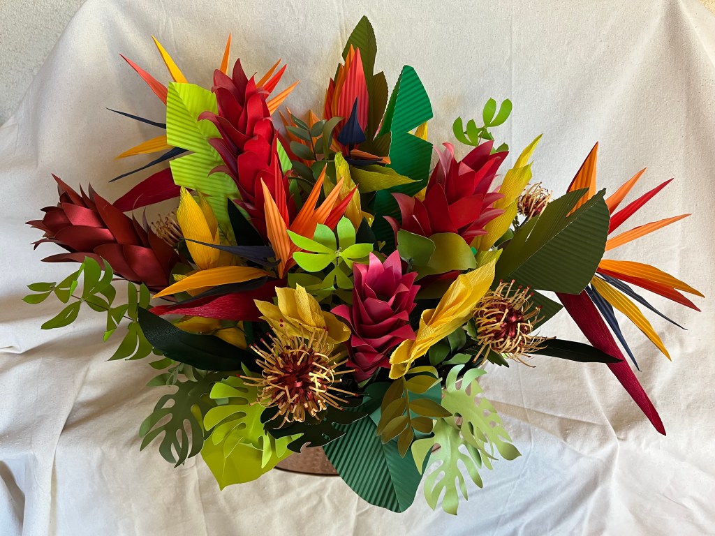 Various tropical flowers. The ginger, leaves, and pincushion protea are made from frosted paper or light card stock as are the petals of the bird of paradise. The heliconia and parts of the bird of paradise are crepe paper.