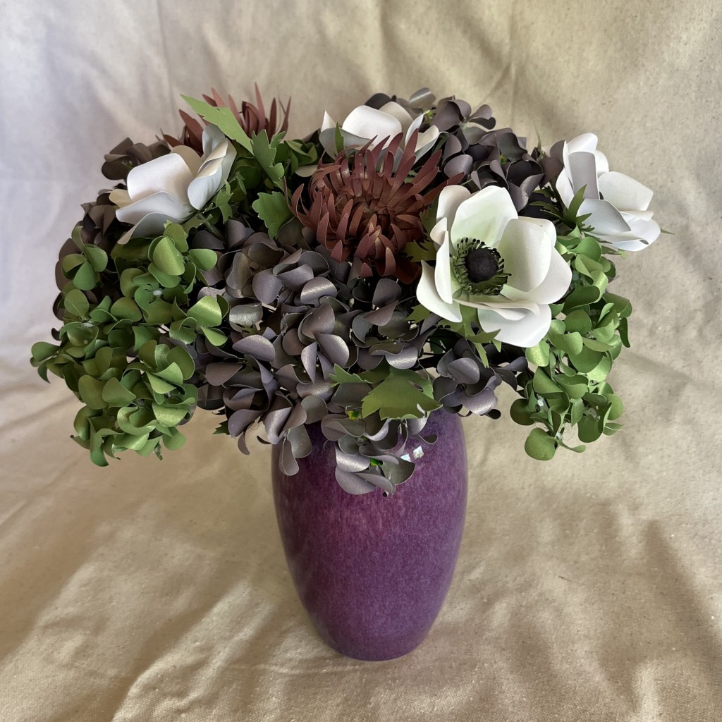 Hydrangeas, anemones, spider mums. Frosted paper.