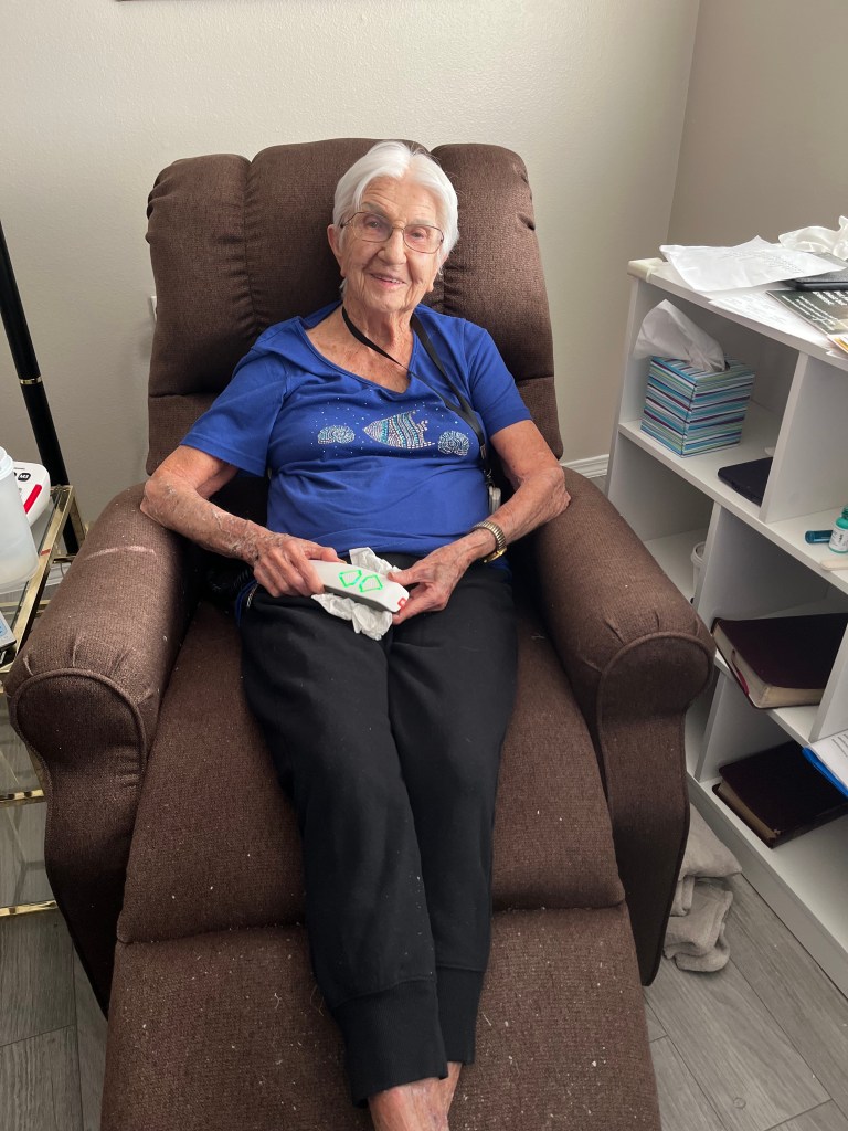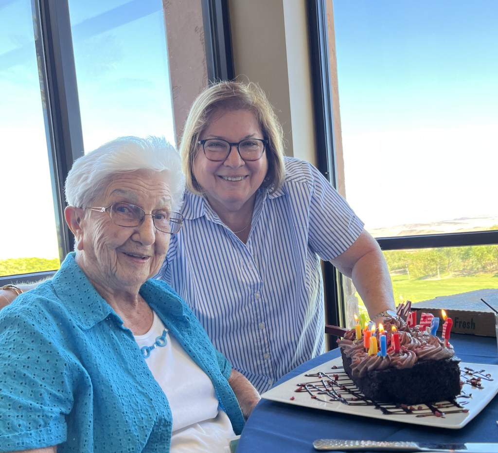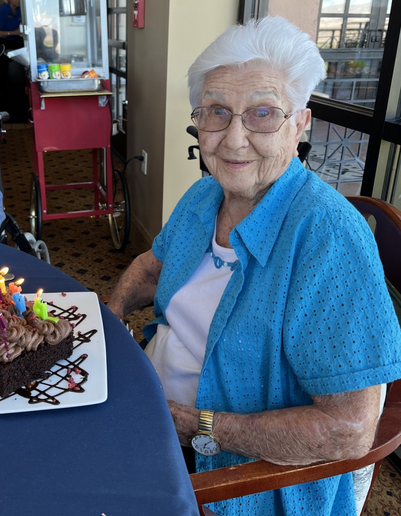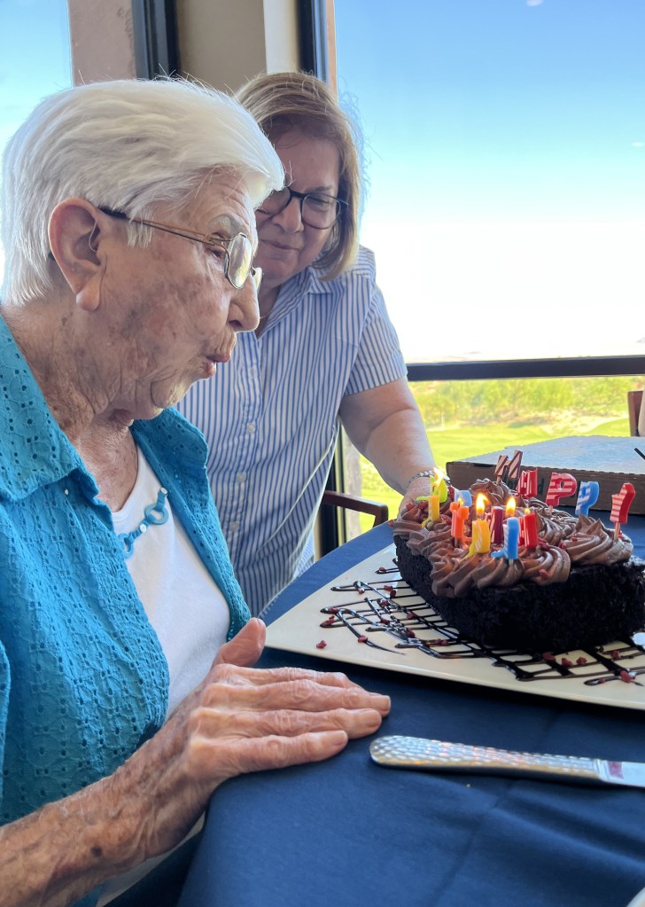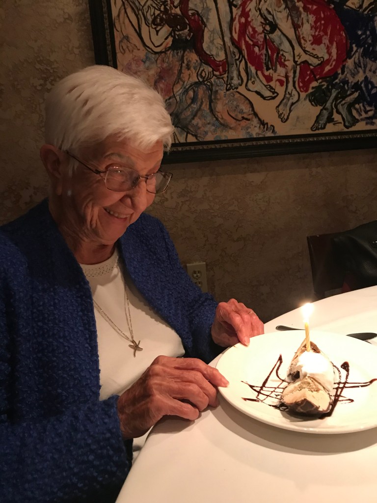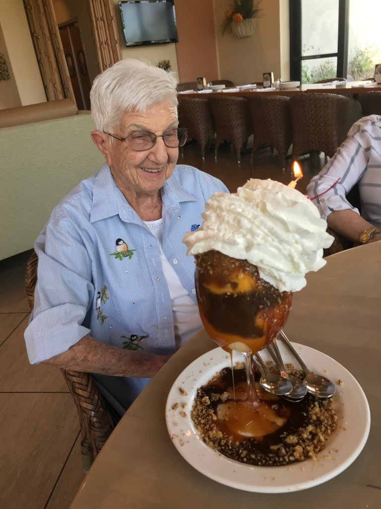 As some of you know, one of mom’s traditional birthday deserts is the “Messy Sundae” from Sammy’s. Here she is enjoying one while celebrating her 95th birthday.