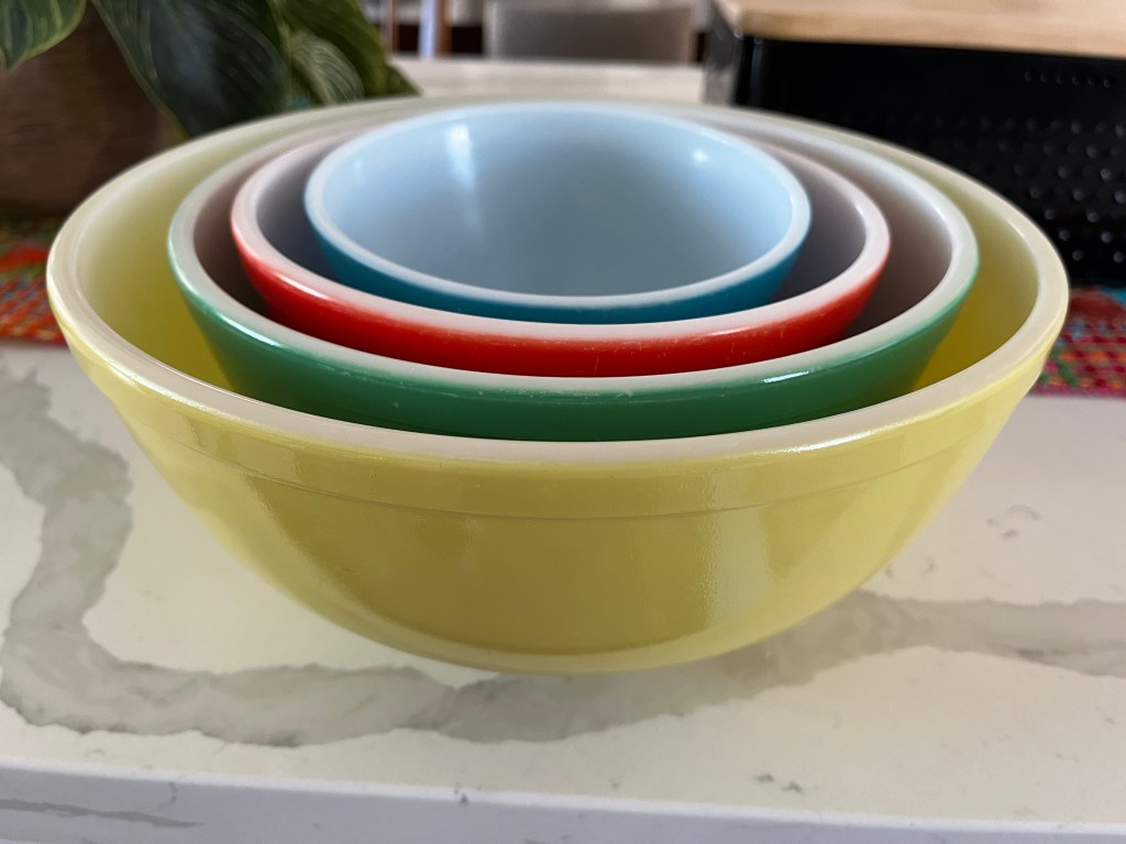 I made a dish this past weekend that used a recipe that has been in my family for many years. It’s a dish I helped my mom with many times as we often took it to potlucks. As I set out to make it, I realized I couldn’t picture mixing it in anything other than my mom’s (and now mine) yellow, Pyrex bowl. The bowl seemed almost as much a part of the recipe as the ingredients themselves!